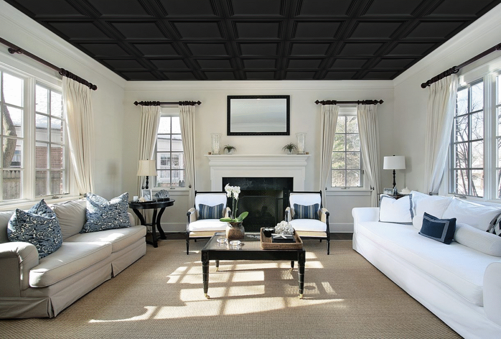 Example: A navy blue ceiling with brass lighting fixtures adds a luxe, modern vibe to a simple living room.